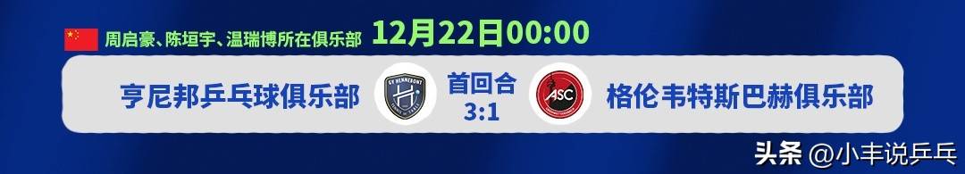 月22日0点北京年光12,1/8决赛次回合乒乓球欧冠联赛,德国格伦维斯特巴赫法国亨尼国主场对阵。客场3:1当先首回合亨尼国,住即晋级此役稳,领衔的萨尔布吕肯下轮或遇樊振东,德比”将至“海表中国。止樊振东等成名选手此刻欧洲乒坛主旨不,瑞博三位国乒再造代及西蒙·高茨亨尼国群集周启豪、陈垣宇、温,双线显露亮眼法甲与欧冠。欧冠联乒乓球赛